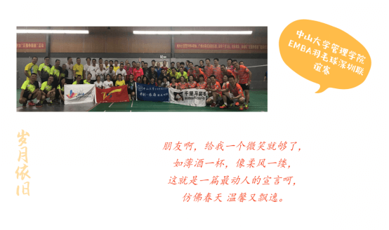 2018年7月7日中山大學(xué)EMBA羽毛球協(xié)會深圳聯(lián)誼賽在校友的支持下順利舉行,中山大學(xué)EMBA校友周秋瑾、李向東分別作為本次聯(lián)賽的主辦方和協(xié)辦方,作為主辦方的周秋瑾為了聯(lián)誼賽付出了很多心血,也正由于他的辛苦付出,才使得本次比賽在友好和諧的氛圍中完美落幕。 以球會友,“羽”情相融,再敘同窗情。參加本次聯(lián)誼賽的有中山大學(xué)管理學(xué)院EMBA羽毛球協(xié)會主席林海麗,參加比賽的各隊隊長均為中山大學(xué)管理學(xué)院EMBA校友,他們都是率領(lǐng)著自己的俱樂部親自上陣,參賽隊伍主要有廣州市V5羽毛球俱樂部(隊長關(guān)山)、中山大學(xué)管理學(xué)院EMBA黃埔32期動動羽毛球俱樂部(隊長梁允勝),深圳羽林軍羽毛球俱樂部(隊長周秋瑾)、深圳千里馬羽毛球俱樂部(隊長李向東)。 比賽中發(fā)揚(yáng)了“友誼第一、比賽第二”的體育精神,各位參賽校友走出校門,在社會上摸爬滾打,至今已有十幾載,歲月在各自的臉龐心間也已印刻出了不同的滄桑質(zhì)感,但只要走上賽場,沉睡于靈魂中的熱血激情就被喚醒,臉上輕松的笑容、場上矯健的身姿,像極了十幾年前穿著校服的一張張青澀、純真的少年,尤其是中山大學(xué)管理學(xué)院EMBA黃埔32期動動隊,一個班組成了一支實(shí)力不凡的10人隊伍,在比賽過程中團(tuán)結(jié)合作、默契配合,是“奮斗、愛、分享”精神最生動的詮釋和體現(xiàn)。曾經(jīng)校友相聚于球場,便將半世滄桑拋腦后,一朝何妨作水仙。 經(jīng)不住逝水流年,逃不過此間少年,各位校友歷盡浮世紅塵飄零半,歸來只得一生坦誠,飽經(jīng)世故氣猶全。同窗四載情深意,吾拾憶兮君未離,那些被時光偷走了的,也只是那把年少青澀的傘。 一朝同窗,一生校友,愿大雨澆不滅你的熱情;愿你在外漂泊半生,歸來依舊赤誠;一生很長,愿時光變緩,愿故人不散。既然許久不見,相聚甚短,那我們就約好:下次球場,再見!
