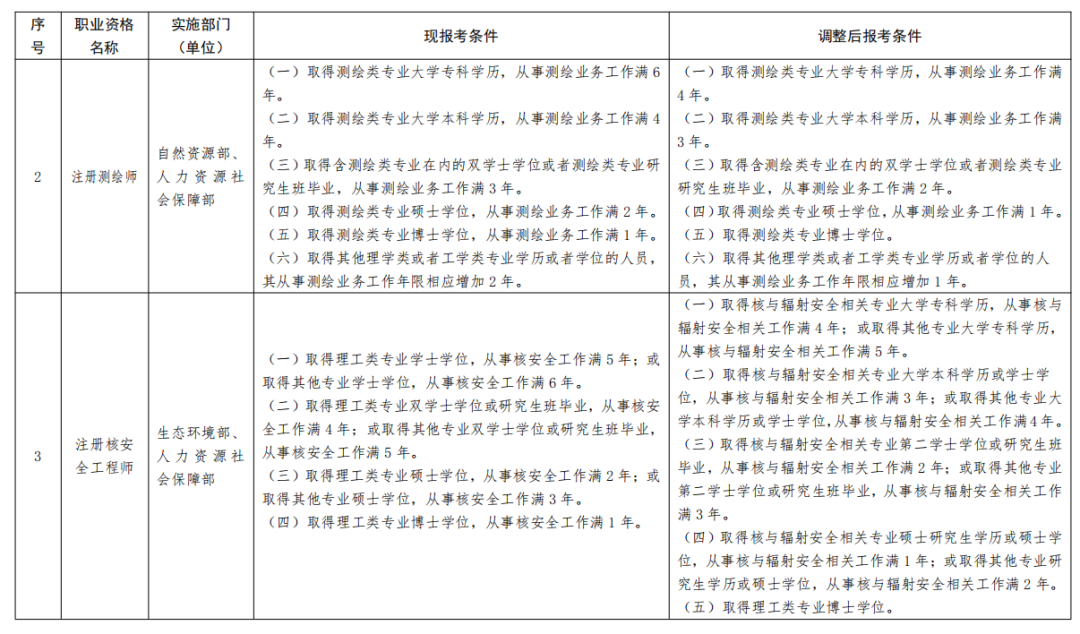 一、《部分準(zhǔn)入類職業(yè)資格考試工作年限要求調(diào)整方案》(見(jiàn)附件)自2022年起實(shí)施。除調(diào)整考試工作年限要求外,13項(xiàng)準(zhǔn)入類職業(yè)資格的其他考試報(bào)名條件不變。