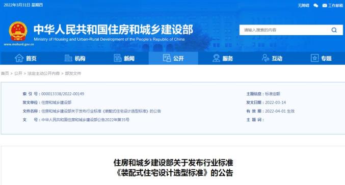 3月31日,住房和城鄉(xiāng)建設(shè)部發(fā)布行業(yè)標(biāo)準(zhǔn)《裝配式住宅設(shè)計(jì)選型標(biāo)準(zhǔn)》,編號(hào)為JGJ/T494-2022,自2022年4月1日起實(shí)施。該標(biāo)準(zhǔn)適用于裝配式混凝土結(jié)構(gòu)和裝配式鋼結(jié)構(gòu)的住宅設(shè)計(jì)。