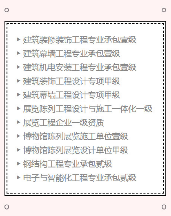 現(xiàn)在,深圳千里馬裝飾集團(tuán)已經(jīng)形成以建筑裝飾裝修工程為核心,建筑幕墻工程、智能化工程、鋼結(jié)構(gòu)工程、展陳工程等領(lǐng)域齊頭并進(jìn)的格局,是集策劃、設(shè)計(jì)、施工、軟裝為一體的裝飾整體服務(wù)提供商?,F(xiàn)持有資質(zhì)如下: