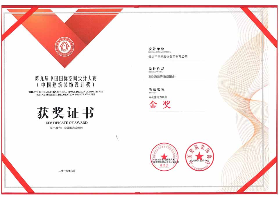 中國(guó)國(guó)際空間設(shè)計(jì)大賽是中國(guó)建筑裝飾設(shè)計(jì)界最具權(quán)威和影響力的頂級(jí)賽事,與中國(guó)建筑工程裝飾獎(jiǎng)同為中國(guó)建筑裝飾領(lǐng)域最高榮譽(yù)獎(jiǎng),也是大國(guó)工匠探索之路上,最好的史冊(cè)記載。獲此殊榮,有力印證了行業(yè)及社會(huì)各界對(duì)深圳千里馬裝飾集團(tuán)卓越設(shè)計(jì)水平的認(rèn)可。