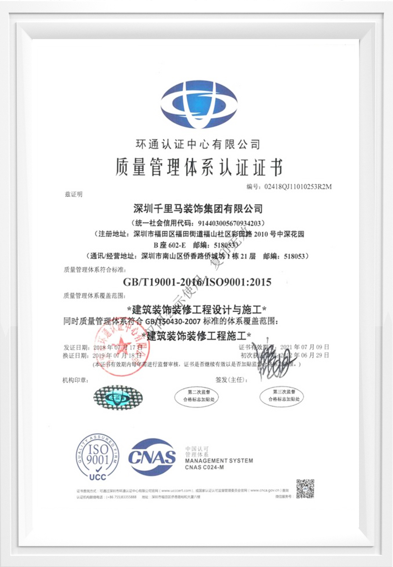 深圳千里馬裝飾集團有限公司成立于2010年,總部位于中國深圳,注冊資金1億元,中國建筑裝飾行業百強企業,經過10余年的發展,形成了以建筑裝飾產業為主體的專業化自營集團公司。集團建立了規范的生產、管理體系及優秀施工、管理人才的培養體系,以生產管理流程及優秀人才為依托,保證交付產品的一致性及均好性,以品質立業。
