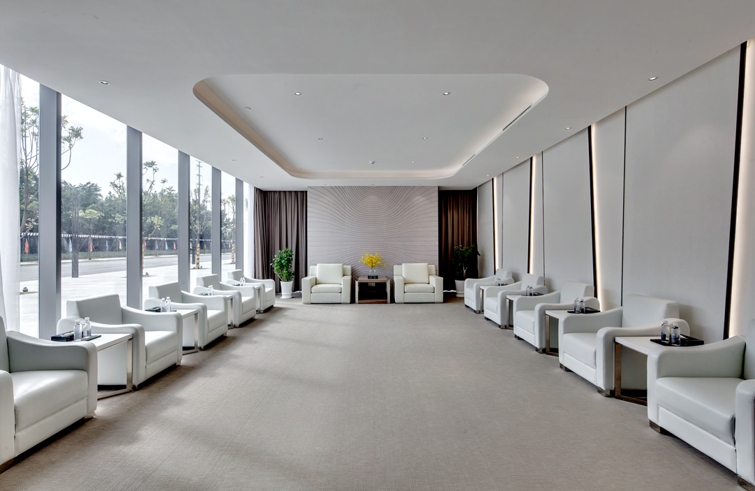 入口辦公前臺區(qū)墻面和前臺運(yùn)用幾何分割設(shè)計,簡約的材料遇上瘋狂的切割,便會形成獨特的形態(tài),背景墻白色乳膠漆,前臺是白色石材,地面是灰色條紋地毯。同時銷售中心和辦公室墻面以白色乳膠、水泥板、黑色不銹鋼為主,地面木地板,灰色地毯為主,水吧區(qū)域,沙發(fā)用顏色去點綴,在空間節(jié)奏的變化、自然光影的引入和材料肌理的運(yùn)用,為至銷售中心和辦公室創(chuàng)造豐富和有趣的觀展體驗。